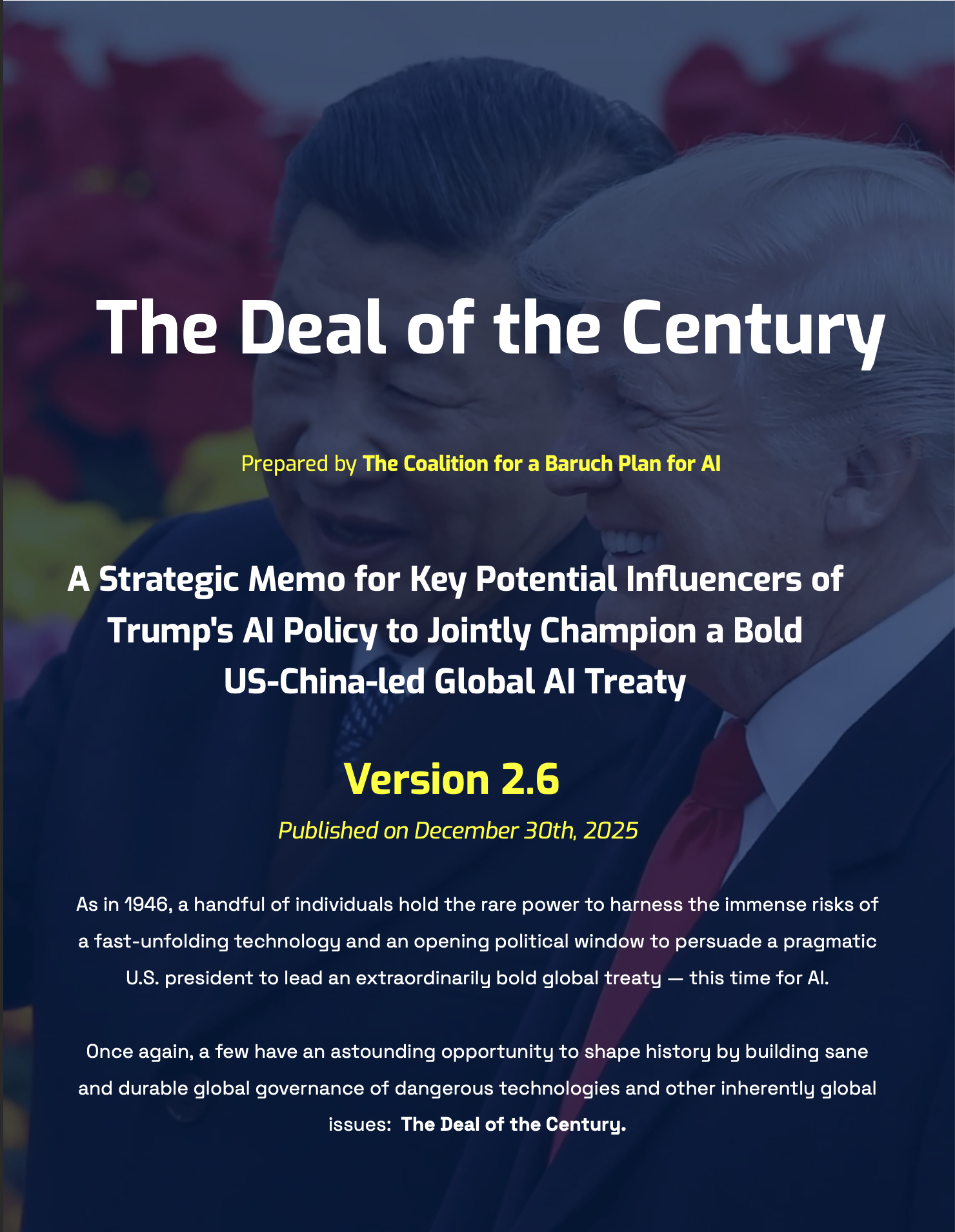 Across 356 pages, the Strategic Memo seeks to persuade and empower a critical mass of key potential influencers on Trump's AI policy to join in an informal humanist AI alliance to persuade Trump — on exclusively realist and pragmatic terms — to co-lead with Xi a bold, timely and proper US-China-led AI treaty-making process.